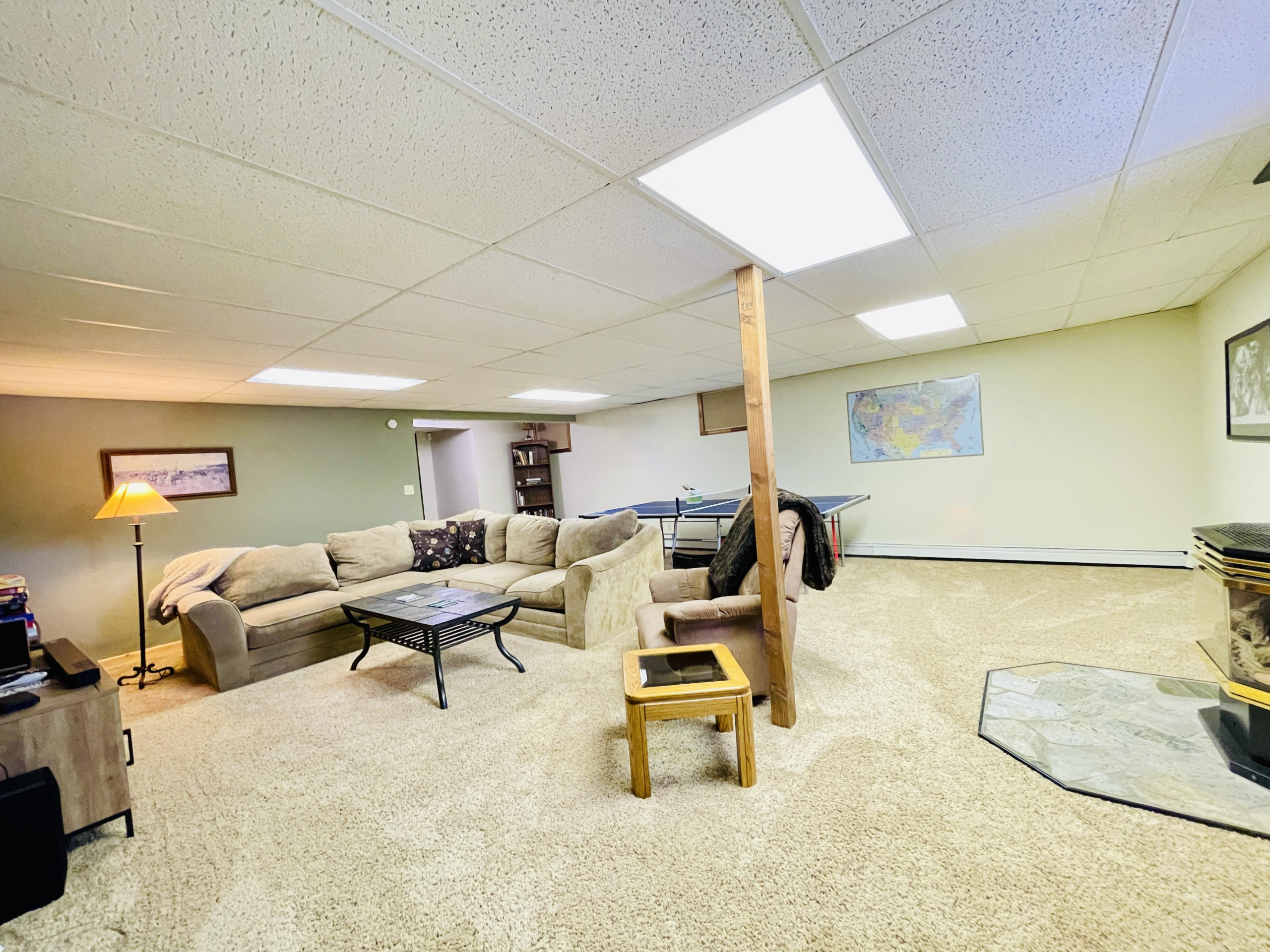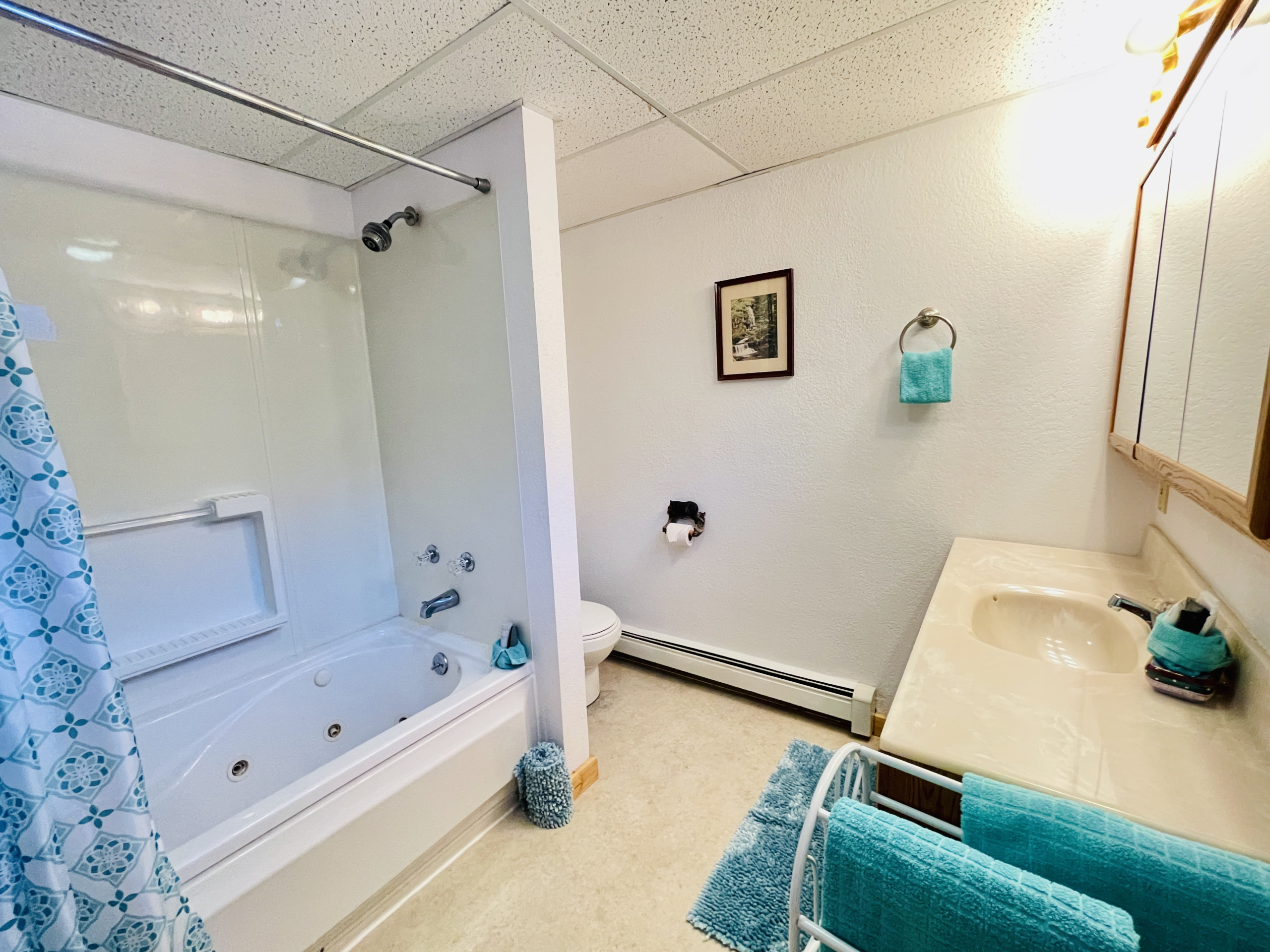 The master room has a queen bed and a private ¾ bath. There’s another queen bed in the second bedroom and 2 queen beds share the floor in the third bedroom. There’s a full size bath between the two bedrooms.